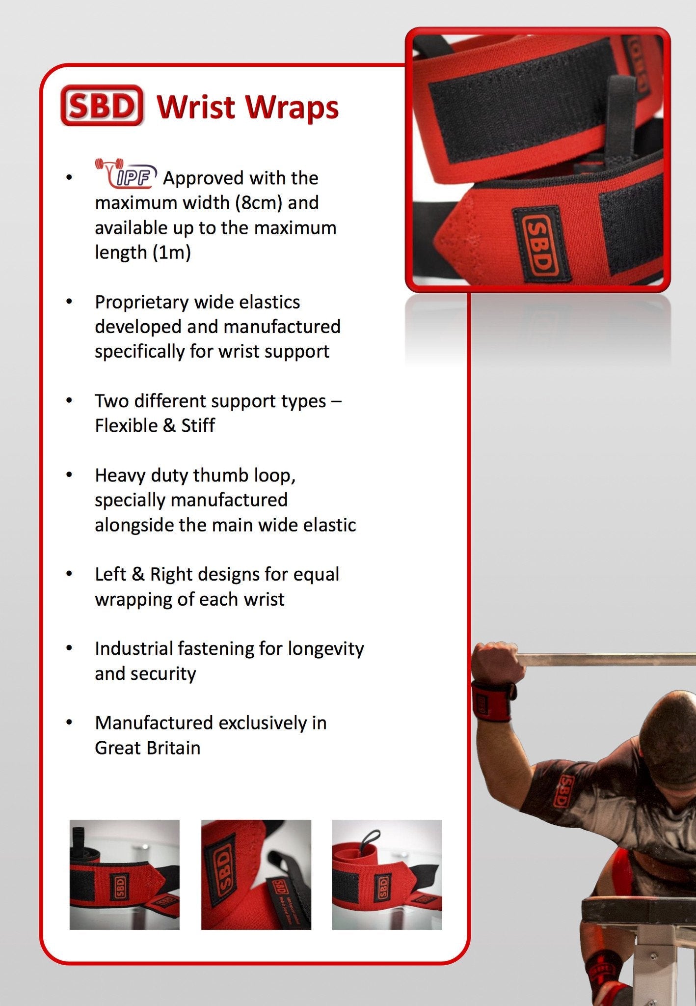Designed specifically for wrist support and pressing movements. Featuring a heavy duty thumb loop alongside industrial fastening to ensure longevity and security.